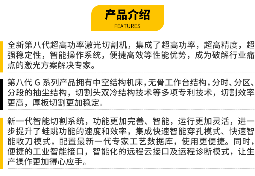 激光切割技術的逐漸普及,使其應用領域得到不斷拓展和加深。市場對超厚板穩定加工、無煙無塵、高效切割以及服務質量提出了更高的要求。迅鐳激光繼往開來、永續創新,始終位于“高功率與智能化”激光切割技術領域制高點。第8代激光切割裝備擁有10大核心優勢,助力客戶降本增效,樹行業高端典范。