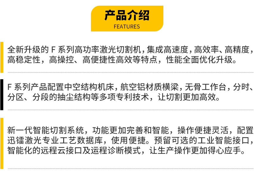 激光切割技術(shù)的逐漸普及,使其應(yīng)用領(lǐng)域得到不斷拓展和加深。市場對超厚板穩(wěn)定加工、無煙無塵、高效切割以及服務(wù)質(zhì)量提出了更高的要求。迅鐳激光繼往開來、永續(xù)創(chuàng)新,始終位于“高功率與智能化”激光切割技術(shù)領(lǐng)域制高點。第8代激光切割裝備擁有10大核心優(yōu)勢,助力客戶降本增效,樹行業(yè)高端典范。